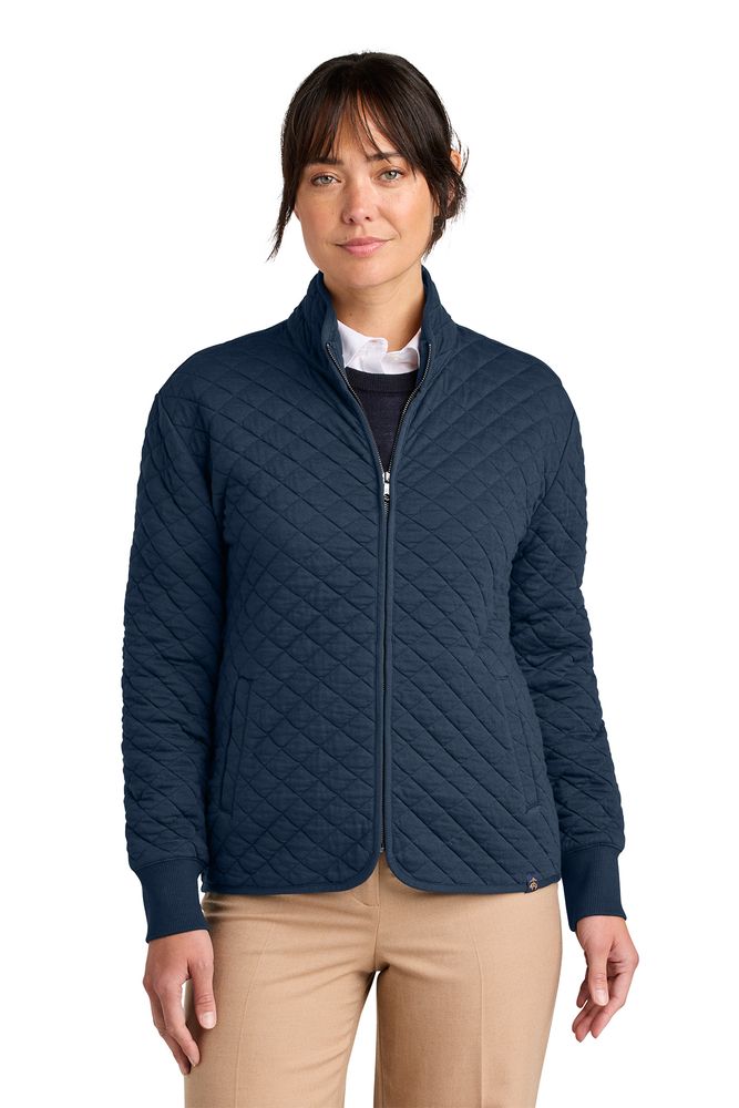 • Add a touch of sophistication to any outfit with a diamond quilt layer. These luxurious fleece pieces are built to last and make a heritage statement with unequaled style and functionality. • 10-ounce, 60/38/2 cotton/recycled polyester/spandex double knit • Brooks Brothers tie-stripe neck taping • Half-moon at back neck • Drop shoulders • Metal zipper with antique silver Brooks Brothers logo zipper pull • Bound interior seams • Angled front pockets • 2x2 rib knit cuffs • Slight drop hem • Brooks Brothers Golden Fleece logo at left hem